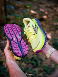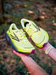 Je me suis tout de suite sentie en confiance, même quand le terrain devient plus technique, la semelle reste stable même sur les devers. Attention aux pieds fins, il faut juste bien ajuster le serrage, le laçage est un peut court et le maintien cheville a tendance à bouger. Le pied n’est pas totalement verrouillé à l’arrière.