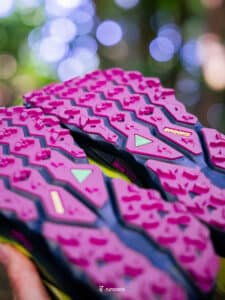 Alice : Très bonne surprise ici avec la semelle TrailTack Green fait le taf sur la plupart des terrains cailloux, racines, sols mouillés. Pour du trail polyvalent (sec, humide, technique), l’adhérence est au top avec ses crampons de 4,5mm.