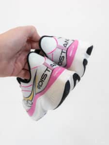 La version en collaboration avec Distance a mis le paquet au niveau de la boîte qui contenait un sac en nylon (type tote bag), un sac pour mettre la paire, un document explicatif de la collab’ et bien sûr, la paire. La première impression est visuelle, un blanc et rose très flash. Aux pieds, on sent que la paire est plus lourde que sur l’ancienne version.