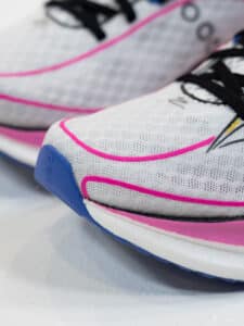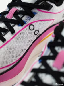 La géométrie SPEEDROLL reste au cœur du modèle. Elle favorise une transition fluide du talon vers l’avant-pied, avec une sensation de bascule marquée mais progressive. L’empeigne en mesh technique gagne en souplesse et en respirabilité, tout en maintenant correctement le pied lors des phases d’accélération. Le chaussant se veut plus homogène, avec moins de pression sur le médio-pied que sur certaines versions antérieures.