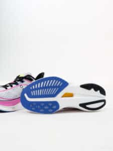 La mousse est en effet plus dure que sur la Speed 4 ce qui donne une nette amélioration de la stabilité mais qui ne casse pas le dynamisme de la paire qui fait son succès dans la catégorie paire d’entraînement.