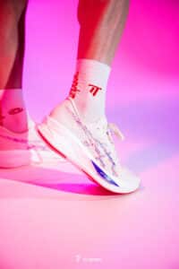 Je trouve la chaussure assez sobre au niveau des couleurs, ici en coloris full white avec des détails violet. Le modèle parait affûté à l’image d’un modèle de compétition.