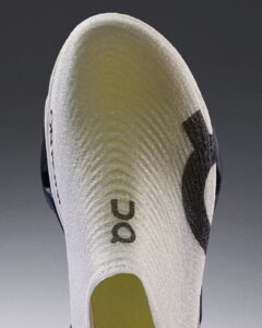 Avec la On LightSpray Cloudmonster 3 Hyper, On industrialise la technologie LightSpray. Le principe repose sur un procédé robotisé dans lequel un fil thermofusé est pulvérisé directement sur un moule. La tige est ainsi construite couche après couche, sans découpe textile classique ni assemblage multipièces. On obtient un upper monobloc, sans couture structurelle, dont la production nécessite seulement quelques minutes.