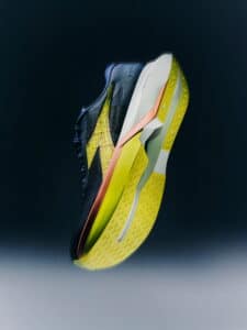 La semelle adopte également une géométrie asymétrique au talon, conçue pour améliorer le support médial lors de l’impact. Par ailleurs, le point de bascule a été repositionné vers l’arrière, une modification qui vise à faciliter la transition et à accentuer la propulsion vers l’avant.