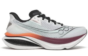 Pour y parvenir, Saucony mise sur sa mousse premium PWRRUN PB, déjà utilisée sur ses modèles les plus performants, qui offre un amorti souple tout en conservant un rebond particulièrement dynamique. L’ensemble est associé à la géométrie SpeedRoll, signature de la gamme Endorphin, qui facilite la transition talon-pointe et favorise une foulée plus fluide et plus rapide.