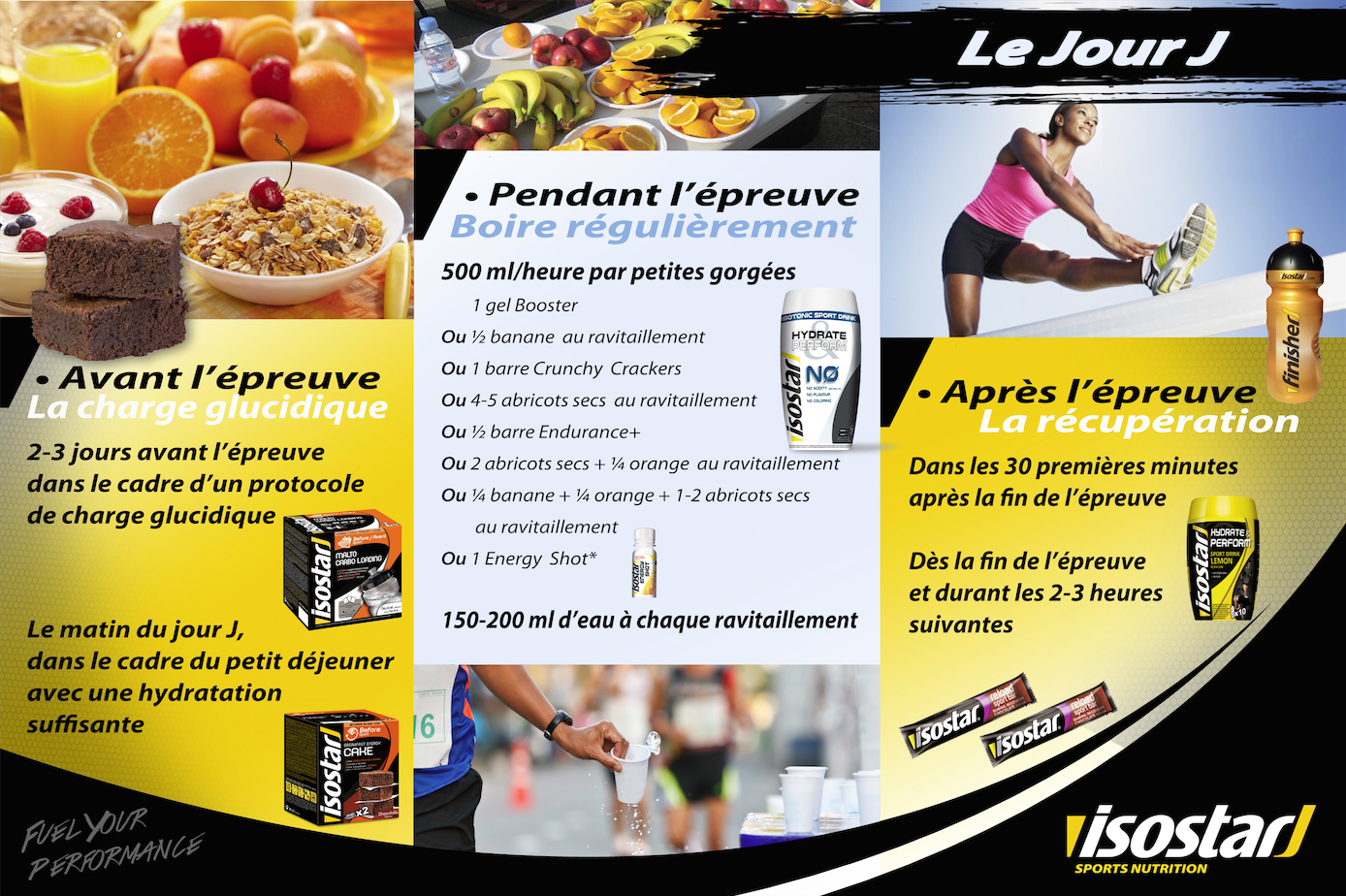 Il faut aussi toujours bien songer à s’hydrater avec au minimum 1,5l d’eau par jour. ISOSTAR conseille également de prendre de la maltodextrine.
