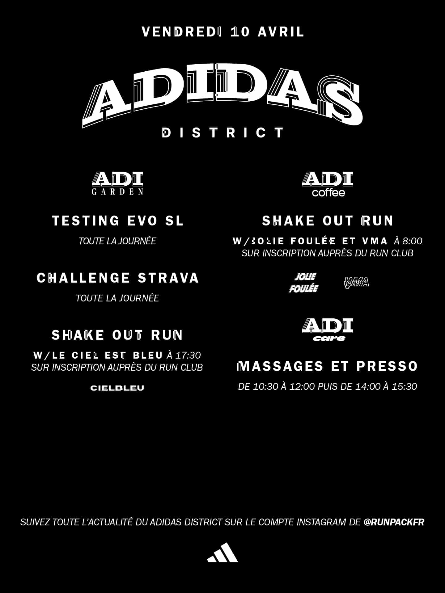 À l'occasion du Marathon de Paris 2026, c'est tout un quartier qui va se mettre aux couleurs d'adidas. Avec son opération baptisée adidas DISTRICT, la marque aux trois bandes va investir des commerces existants pour en faire des lieux de vie pour ses différentes activations et mettre en avant la EVO SL. Un riche programme dont runpack sera le média insider.